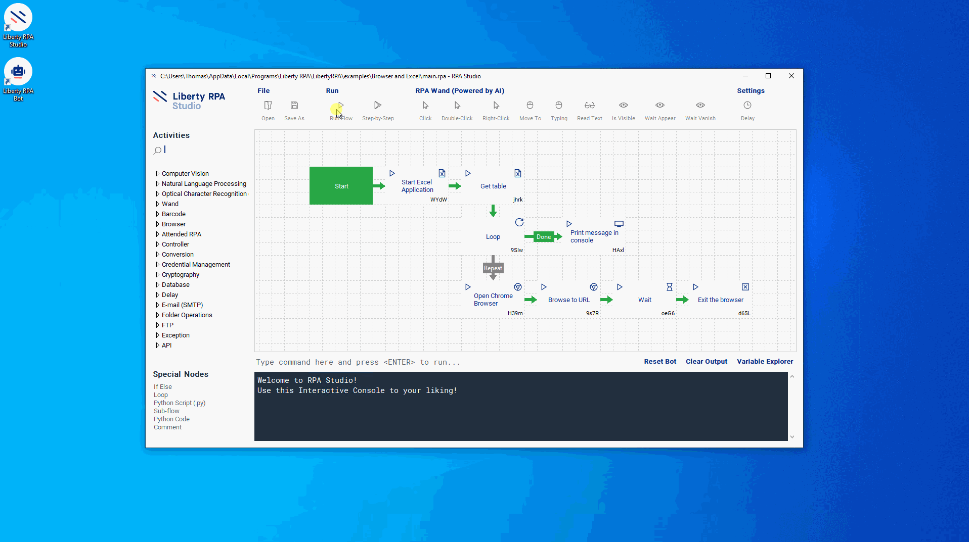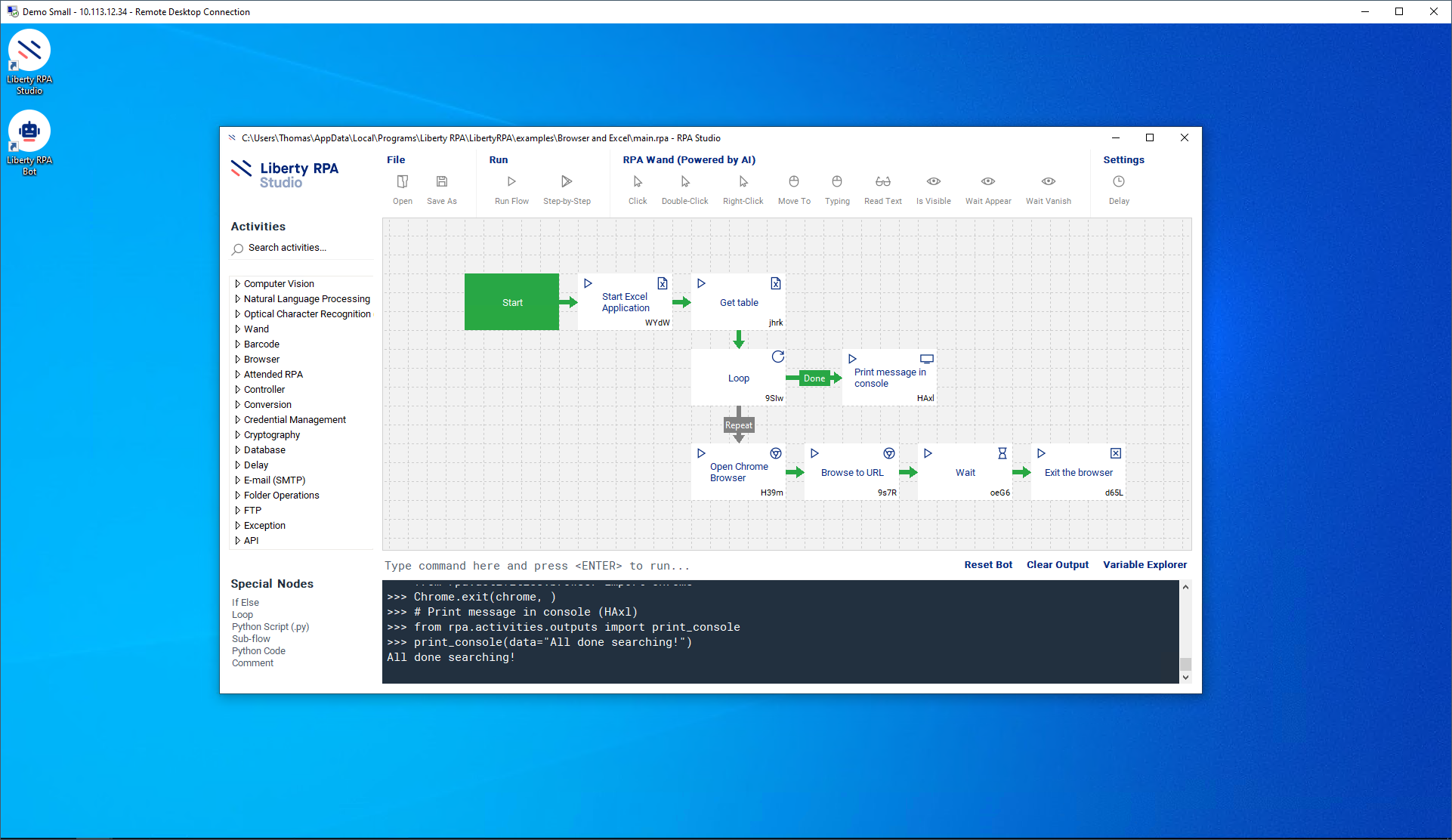 Use Liberty RPA’s Microsoft Excel activities together with browser activities (Google Chrome) and the loop special node.