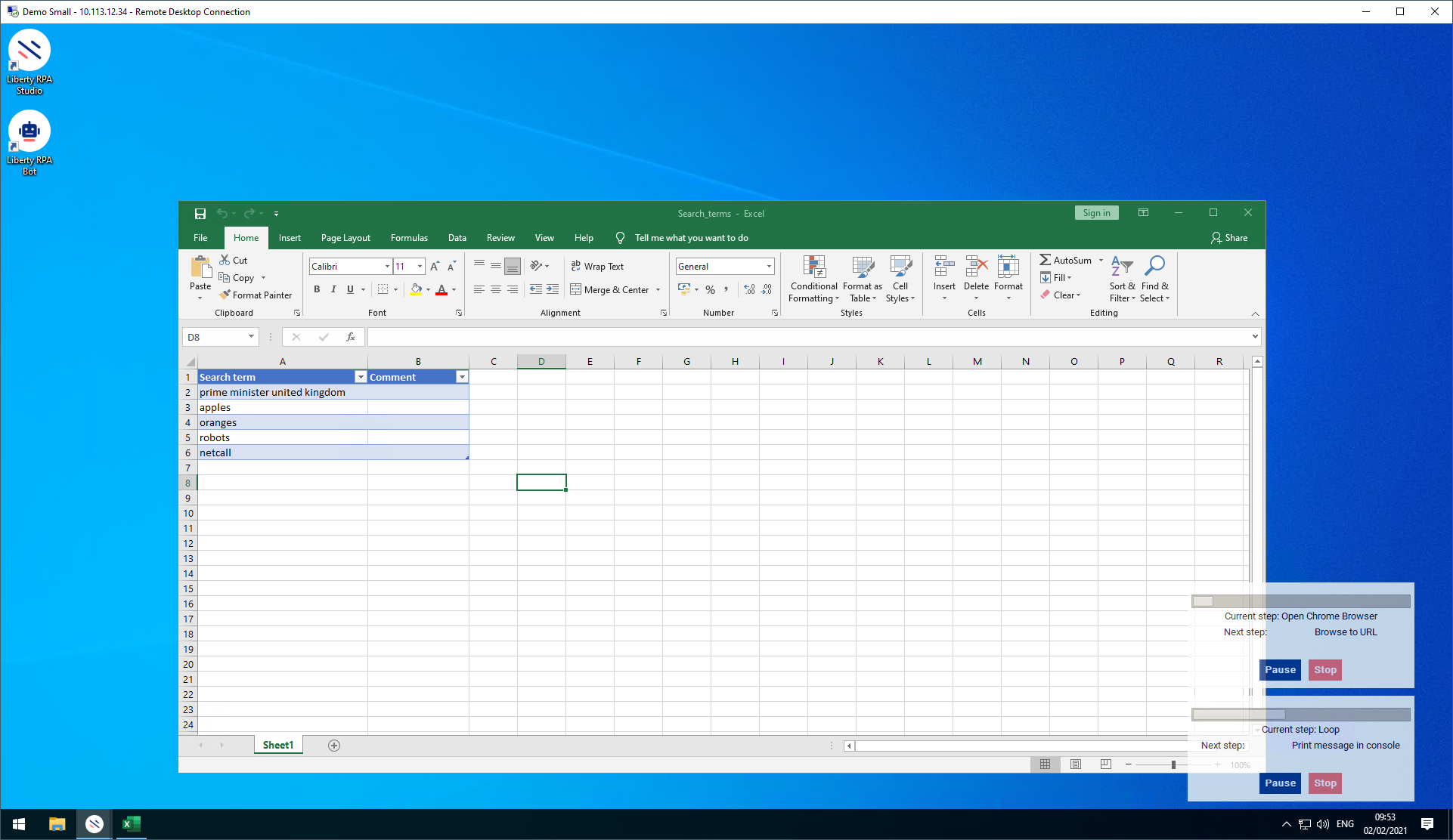 Use Liberty RPA’s Microsoft Excel activities together with browser activities (Google Chrome) to perform automated searches.