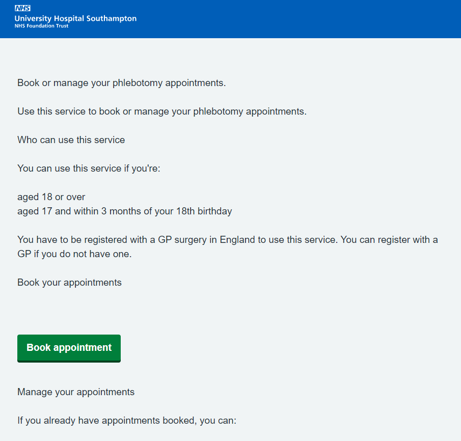 The aim of the application was to digitise the current phlebotomy appointment booking process and allowed UHS to fully replace the as-is process with a fully online appointment management system configured in Liberty Create.