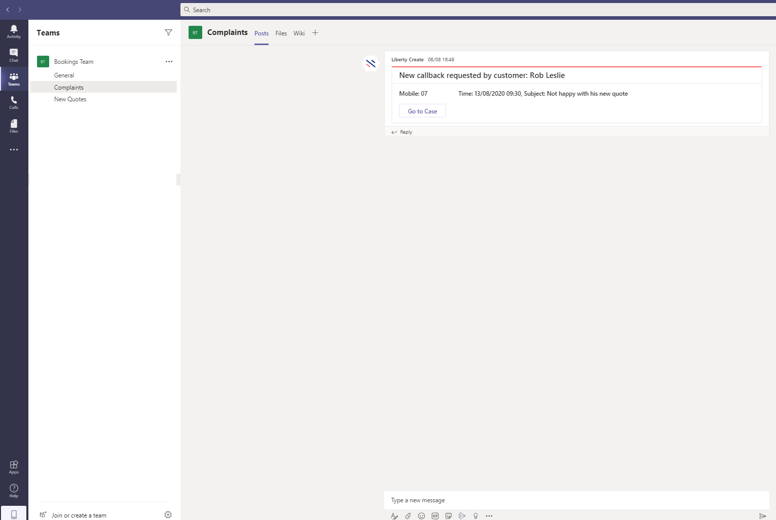 This is combined with some of the Liberty Create Booking and Calendar capabilities. Information can also be passed to customers via SMS or email and then finally into Microsoft Teams for awareness.