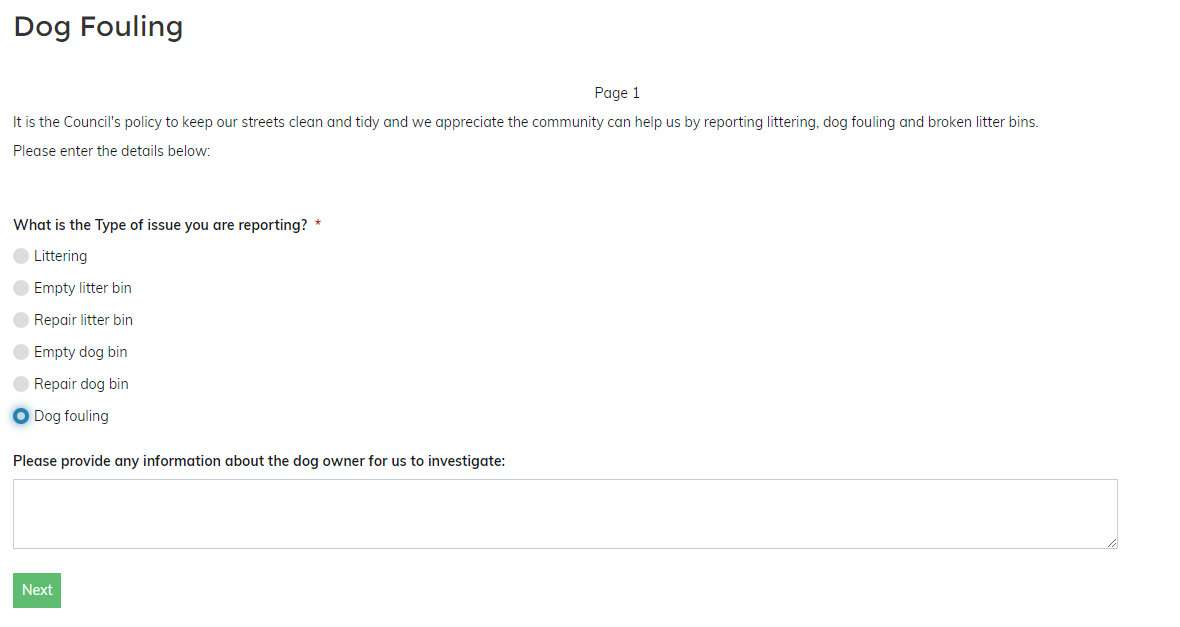 The CH Dog Fouling Module provides a way for citizens to report Dog Fouling to the Council.   It includes the ability to provide information about the person suspected of not cleaning up after their dog along with specific information about the location,