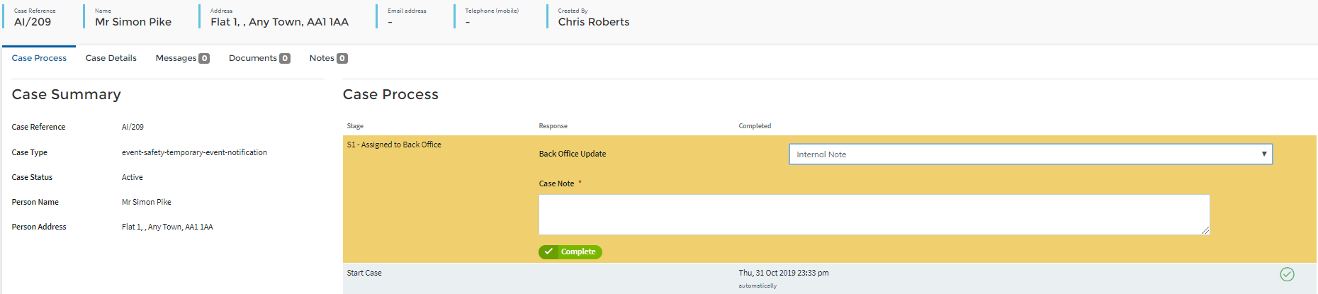 Once a form has been submitted, a case and workflow process are started in CH managing the lifecycle of the application for the Event Safety / Temporary Event Notification from start to finish.