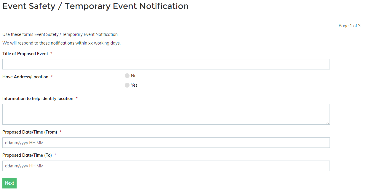 The CH Event Safety Module module has been built to allow customers to apply for Event Safety / Temporary Event Notifications. It has been designed to be used by Agents or on the Portal. Part of the module is the initial capture form, which will be required to be completed and submitted to the local authority in order to progress this as a case.