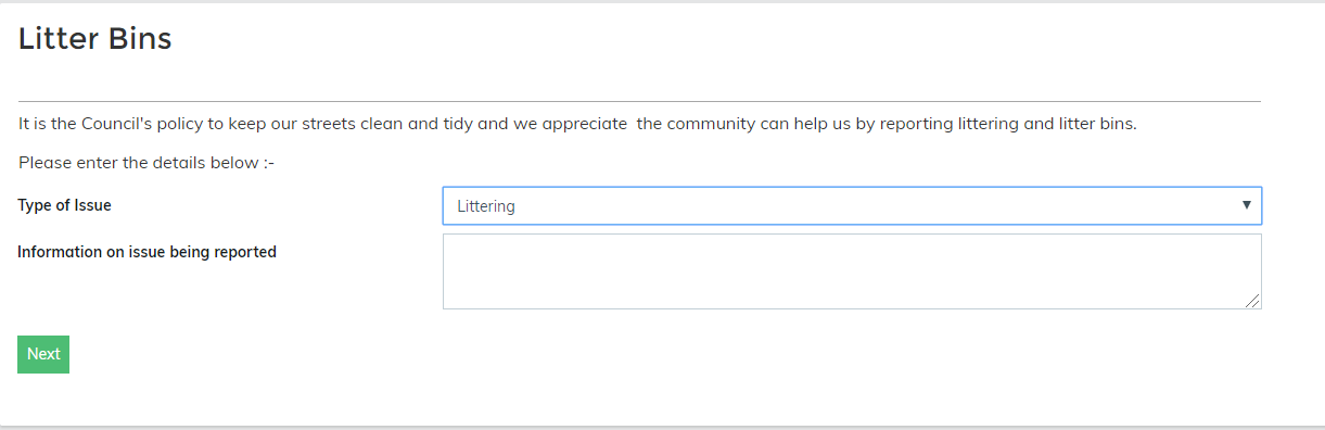 Local Councils have a responsibility to monitor their public waste bins and for the prosecution of Littering. In order to do this they are reliant on members of the public reporting incidents of overflowing bins, littering, or even a damaged bin, to the council. The CH Litter Bins Module has been built to allow a member of the public to report a range of issues and to provide specific details as to the location of the incident. If they are not aware of a specific address then they have the option to provide more specific information about the location and / or the incident. There is the option to upload photos as part of the reporting the incident. This may include either photos of the incident itself, or photos of the person, or persons, that were littering. It has been designed to be used by Agents, or on the Portal. The module includes the initial capture form which will be required to be completed and submitted to the local authority in order to progress this as a case.