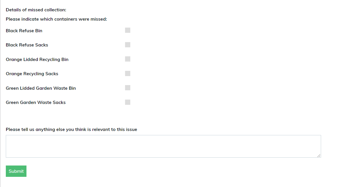 The module includes specified bin types based on an example council. It is likely that the bin types may need to be renamed or some added / removed depending on the council. These are set to just Boolean data types and presented on the form as tick box items.