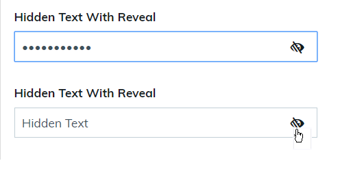 The Hidden Text with Reveal Presenter enables sensitive fields to be hidden by default, and allow their reveal by clicking and holding on the eye icon. The field may be set as editable or non-editable.