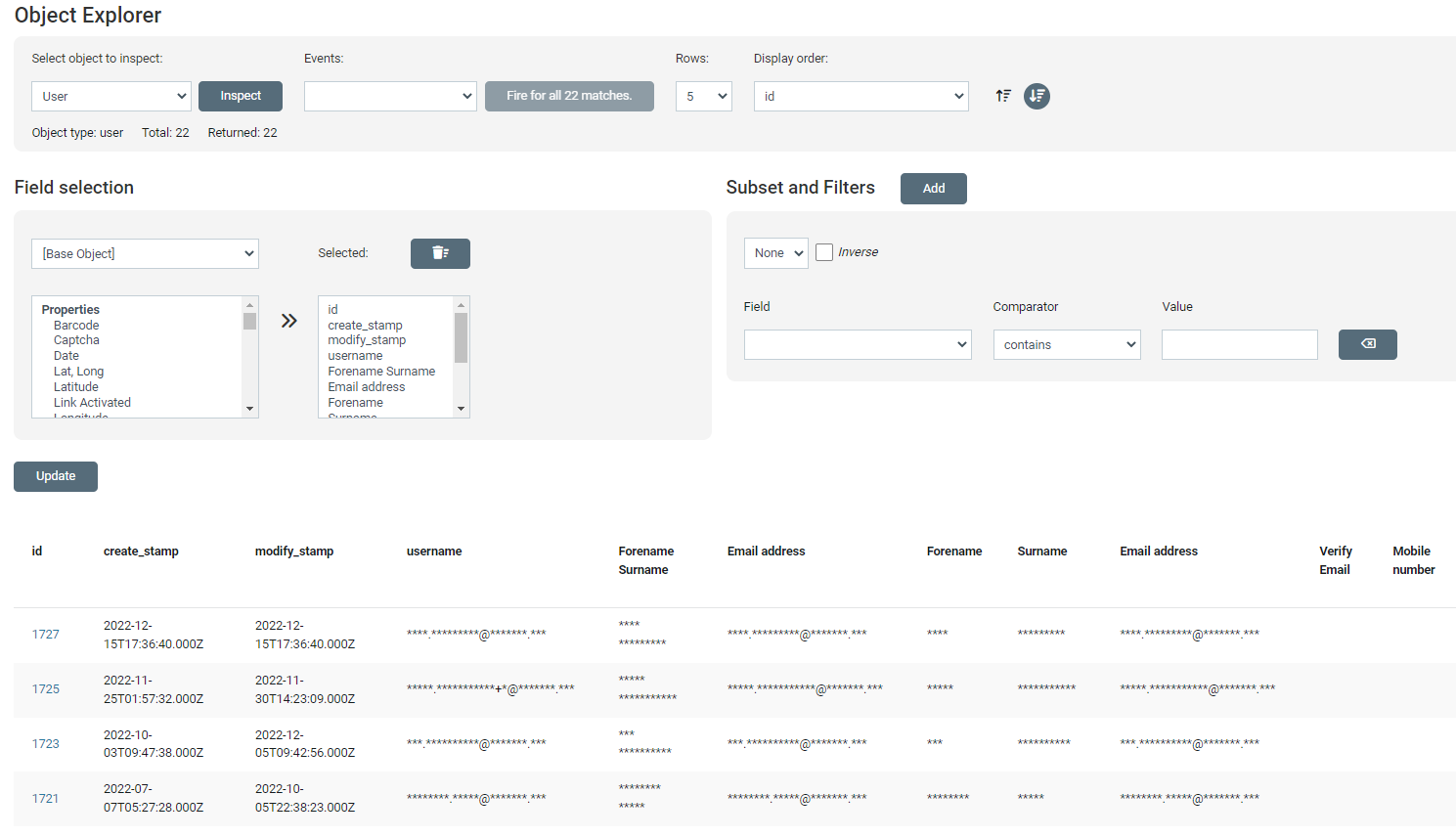 The Object Explorer is intended to be used alongside the Record Inspector Widget. Records returned in Object Explorer can be clicked through to the Record Inspector. Once set the id will appear as a clickable link.