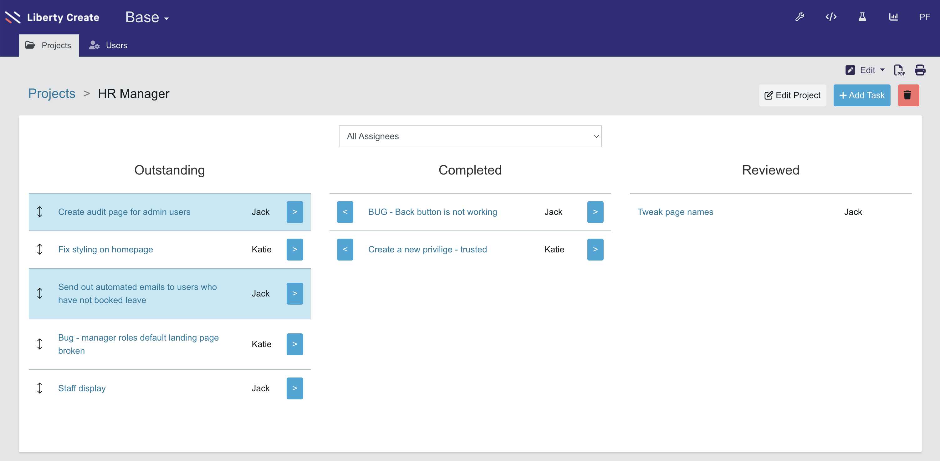 From this project view, tasks can be pushed left and right to change the status of the task, in a manner similar to Kanban. Tasks in the Outstanding column can also be reordered to indicate priority. The tasks can be filtered across columns by an assignee dropdown.