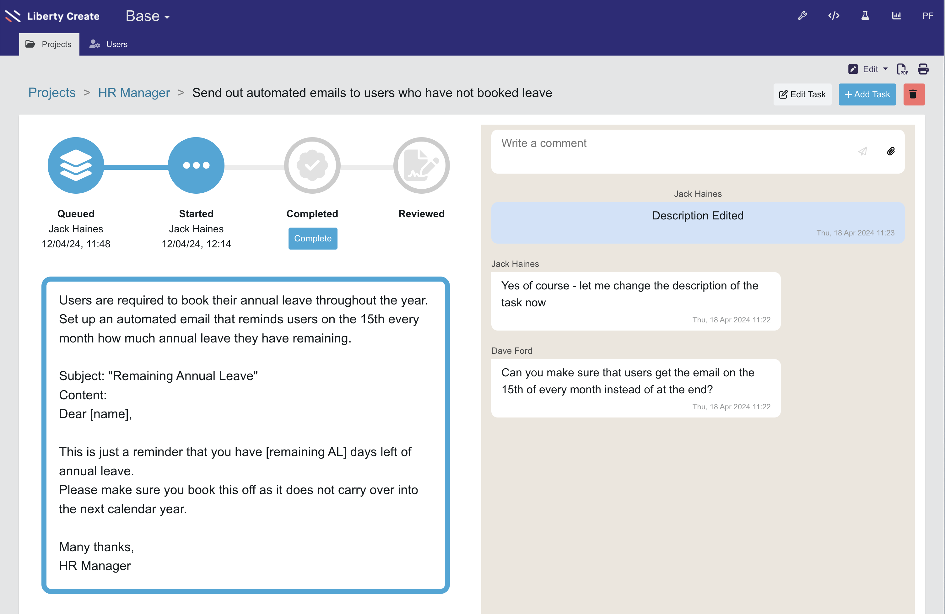 Inside the view of a project, tasks are listed in 3 main columns – Outstanding, Completed and Reviewed. This corresponds roughly to the 4 stages in the process, with both those that are “queued” and those “started” together in the first column (the latter highlighted blue).