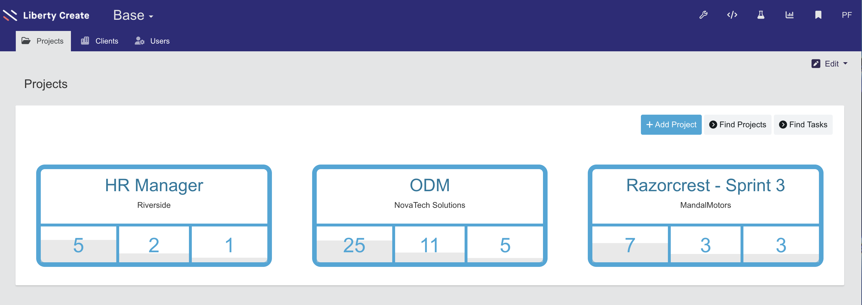 Created projects are presented conveniently as tiles, with counts of tasks at different statuses.