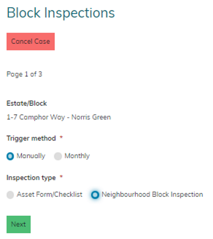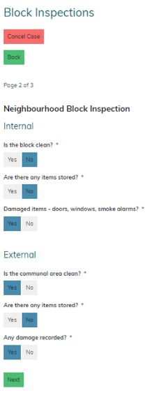 This module provides an inspection process for groups of dwellings such as a neighbourhood or block of flats. Inspections can be manually triggered or automated at specified intervals. The form uses a checklist to help the inspector deliver quality outcomes in a rapid manner. All forms can be easily adapted to include other questions or criteria. Please see an example of an inspection scheduling form and an inspection checklist.